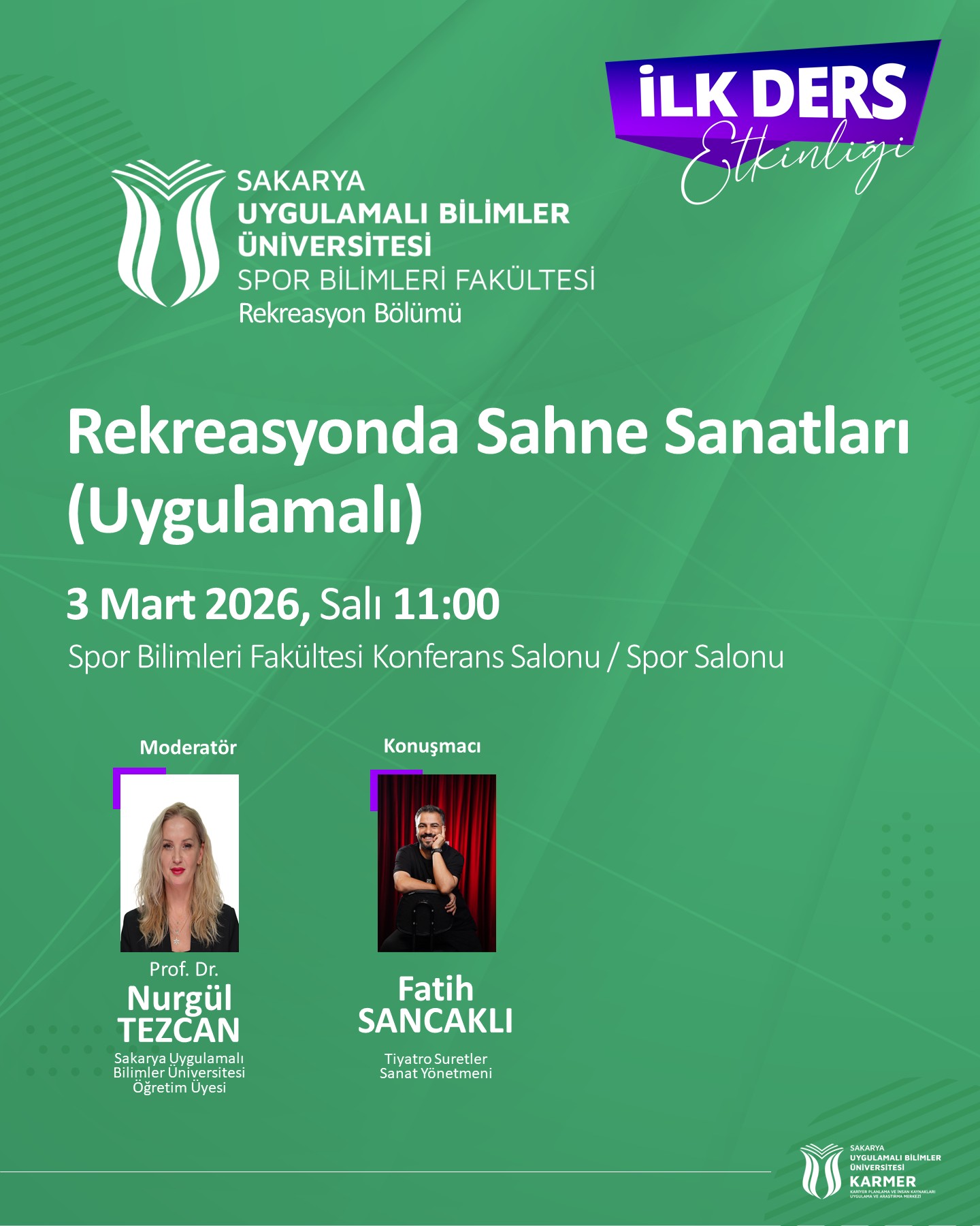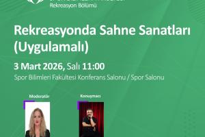 Rekreasyon Bölümü 2025-2026 bahar dönemi "İlk Ders Etkinliği" kapsamında düzenlenecek olan ''Rekreasyonda Sahne Sanatları'' başlıklı program Prof. Dr. Nurgül TEZCAN ve Tiyatro Suretler Sanat Yönetmeni Fatih SANCAKLI'nın katılımıyla 3 Mart 2026 Salı 11:00'da Spor Bilimleri Fakültesi'nde gerçekleştirilecektir.